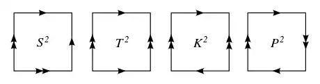 Les bords du carré peuvent ensuite être recollés de différentes manières. Le carré peut être tordu pour permettre aux bords de se rencontrer dans la direction opposée, comme indiqué par les flèches sur le diagramme. Jusqu'à symétrie, il existe quatre manières différentes de coller les côtés, chacune créant une surface différente :