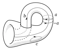est la bouteille de Klein, qui est un tore avec une torsion (La torsion peut être vue dans le diagramme carré comme l’inversion de la flèche du bas). C'est un théorème que la surface recollée doit s'auto-intersecter (lorsqu'elle est dans un espace à 3 dimensions). Comme les tores, les cycles a et b ne peuvent pas être réduits tandis que c peut l'être. Mais contrairement au tore, suivre b en avant, à droite et en arrière retourne la gauche et la droite, car b coupe la torsion donnée à une jointure. Si une coupe équidistante d'un côté de b est réalisée, elle revient de l'autre côté et contourne une seconde fois la surface avant de revenir à son point de départ en découpant une bande de Möbius torsadée. Comme les zones de gauche et de droite locales peuvent être réorientées de manière arbitraire de cette manière, la surface dans son ensemble est dite non orientable.
