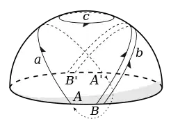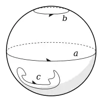 Sur la sphère ordinaire , le cycle b du diagramme peut être réduit au pôle, et même le grand cercle équatorial a peut être réduit de la même manière. Le théorème de Jordan montre que tout cycle arbitraire comme c peut être réduit de la même manière à un point. Tous les cycles de la sphère peuvent donc être transformés en permanence et appartiennent à la même classe d'homologie. On dit qu'ils sont homologues à zéro. Découper une variété le long d'un cycle homologue à zéro la sépare en deux composantes ou plus. Par exemple, découper la sphère le long de a produit deux hémisphères.