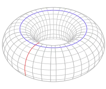 Le tore est défini comme un produit cartésien de deux cercles . Le tore a une composante liée à un chemin unique, deux trous unidimensionnels indépendants (indiqués par des cercles en rouge et bleu) et un trou bidimensionnel comme intérieur du tore. Les groupes d'homologie correspondants sont[16]