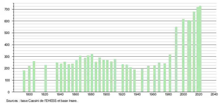 L'évolution du nombre d'habitants est connue à travers les recensements de la population effectués dans la commune depuis 1793. Pour les communes de moins de 10 000 habitants, une enquête de recensement portant sur toute la population est réalisée tous les cinq ans, les populations légales des années intermédiaires étant quant à elles estimées par interpolation ou extrapolation[37]. Pour la commune, le premier recensement exhaustif entrant dans le cadre du nouveau dispositif a été réalisé en 2008[38].