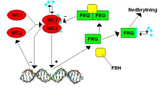 Par la suite, frequency est dégradée rapidement, une caractéristique des IDPs[21],[22] En outre, dès que frequency est traduite, elle est phosphorylée plusieurs fois par plusieurs kinases – CK1, CK2, CAMK1 et PRD-4 –[19],[23],[24],[25], ce qui influence sa stabilité et éventuellement mène à son ubiquitination par FWD-1, une ubiquitine ligase de type SCF[19] Cet évènement libère finalement le complexe white collar complex qui est réactivé via la protéine phosphatase 2A (PP2A) et la protéine phosphatase 4 (PP4) , permettant au complexe white collar complex de se lier au promoteur de frequency à nouveau[16],[26].