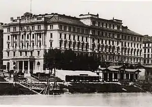 L'hôtel est construit pour l'Exposition universelle de Vienne d'après les plans des architectes Carl Schumann (1827-1898) et Ludwig Tischler (1840-1906), à l'emplacement de l'ancien Theater am Franz-Josefs-Kai qui avait brûlé en 1863. L'immeuble de quatre étages était richement décoré avec des colonnes corinthiennes, des cariatides et des atlantes. La cour intérieure était vitrée et avait une salle à manger richement décorée[1].