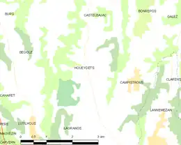 Les communes les plus proches[Note 1] sont[4] : Bégole (2,0 km), Campistrous (2,2 km), Castelbajac (2,5 km), Caharet (3,3 km), Lagrange (3,8 km), Burg (3,9 km), Lutilhous (3,9 km), Bonrepos (4,0 km).