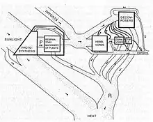 De ce point de vue, les cycles biogéochimiques sont régis par l'énergie rayonnée[21]. Odum exprimait l'équilibre entre l'énergie apportée et restituée comme le rapport entre la production (P) et la respiration (R): P/R. Il classait les organismes aquatiques en fonction de leur taux P/R, et montra qu'il permettait nettement de distinguer les écosystèmes autotrophes des hétérotrophiques. Il semble qu'Odum ait emprunté cette idée aux travaux de son directeur de thèse, G. E. Hutchinson, pour qui une communauté biotique peut être assimilée à un organisme dans la mesure où on peut lui assigner un métabolisme propre[22] ; toutefois, Golley remarque qu'Odum a cherché à caractériser les communautés biotiques par d'autres critères que ce rapport, au risque de contredire les principes de l'énergétique des systèmes.