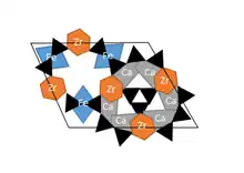 La structure cristalline de l'ikranite peut être décrite comme un cadre d'anneaux tétraédriques de SiO4 à trois et neuf membres, reliés par des anneaux de calcium à six membres et des octaèdres de zinc (titane ou niobium). Les couches sont construites le long de l'axe c comme Si-Zr-Si-Ca. Cette répétition génère 12 couches, d'une taille égale à ~30 Å[5].
