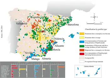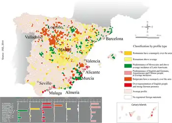 Les différentes nationalités présentes en Espagne présentent des distributions spatiales spécifiques. Par exemple, les Allemands et les Anglais se répartissent préférentiellement sur le littoral méditerranéen et dans les îles Baléares, les Roumains plutôt dans le centre du pays et autour de l'agglomération madrilène, et les Chinois essentiellement dans l'agglomération de Barcelone, de Madrid et d'Alicante/Murcie [5].