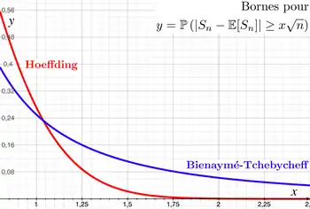 On voit que dans ce cas (et c'est assez représentatif de la situation générale[réf. nécessaire]) l'inégalité de Hoeffding est beaucoup plus précise pour suffisamment grand.