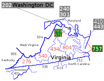 Carte de la Virginie avec les territoires de ses indicatifs régionaux. L'indicatif régional 804 se trouve au centre-est de l'État.