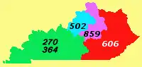 Carte de l'État du Kentucky avec les territoires de ses indicatifs régionaux. L'indicatif régional 859 est en rose.