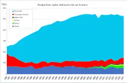Après le déploiement du programme nucléaire militaire, l'industrie nucléaire devient progressivement la principale source de production d'électricité en France. Le nucléaire couvre, en 2016, 72 % de la production française d'électricité, qui représente elle-même 27 % de la consommation finale d'énergie du pays[é 1].