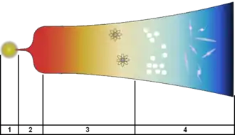 À la fin de l'inflation — les chercheurs l'estiment entre 10−33 et 10−32 seconde après le Big Bang —[réf. souhaitée], l'Univers est encore extrêmement dense et chaud. Ils pensent que sa masse volumique devait être de l'ordre de 1086, voire 1094 kilogrammes par mètre cube, et sa température de 1026, voire 1028 kelvin[réf. nécessaire].