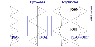 - Amphiboles, inosilicates en ruban ayant une périodicité de deux paires de tétraèdres