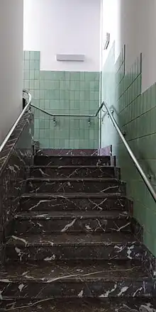 Les matériaux utilisés sont de qualité et mélangent des matériaux industriels comme la brique du pays, du métal et du béton pour l'extérieur avec des matériaux plus nobles comme la pierre bleue, utilisée principalement pour le soubassement. À l'intérieur, nous pouvons retrouver du marbre et des carreaux de faïence assortis dans la cage d'escalier.