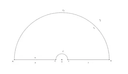Plus précisément, F admet un unique pôle, en 0. Considérons le contour défini comme suit : pour deux réels R > ε >0, on choisit les demi-cercles et de centre O, de rayons R et ε, situés dans le demi-plan supérieur et on les relie par deux segments I et J. Cette courbe délimite un domaine borné du plan ne contenant pas l'origine.
