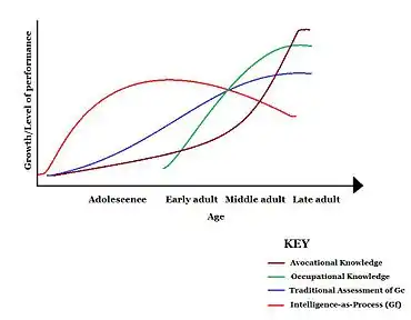 Dans ce contexte, le psychologue et statisticien Raymond Cattell découvre qu'il est possible de distinguer plusieurs composantes du facteur g : l'intelligence fluide ou facteur f, qui est en quelque sorte le moteur qui permet l'acquisition de connaissances, qu'il nomme le facteur d'intelligence cristallisée ou facteur c. Son élève puis collègue John Horn approfondit et développe ce modèle (1965). Des années 1960 aux années 1980, il publie plusieurs résumés des recherches dans le domaine[26],[35],[36]. Le modèle de Cattell et Horn, appelé le modèle Gf-Gc ou intelligence fluide et cristallisée, décrit dix facteurs cognitifs généraux qui sont repris dans les modèles suivants[26].
