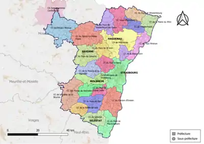 | CC de la Plaine du Rhin | 200041283 | 19 | 18 433 (2019[16]) | 149,80 | 123 | Beinheim | Bernard Hentsch | ||