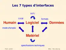 Une interface définit la frontière de communication entre deux entités, comme des éléments de logiciel, des composants de matériel informatique, ou un utilisateur. Elle se réfère généralement à une image abstraite qu'une entité fournit d'elle-même à l'extérieur. Cela permet de distinguer les méthodes de communication avec l'extérieur et les opérations internes, et autorise à modifier les opérations internes sans affecter la façon dont les entités externes interagissent avec elle, en même temps qu'elle en fournit des abstractions multiples. On appelle aussi interfaces des dispositifs fournissant un moyen de traduction entre des entités qui n'utilisent pas le même langage, comme entre un être humain et un ordinateur. Étant donné que ces interfaces réalisent des traductions et des adaptations, elles entraînent des coûts de développement supplémentaires par rapport à des communications directes.