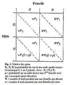 Maynard Smith (1977)[21] utilise ce concept afin de modéliser les différentes stratégies sexuelles que l’on peut rencontrer dans l’investissement parental. Notons qu’il se base sur la définition de Trivers de l’investissement parental (1972)et s’inspire de la critique apportée par Dawkins & Carlisle (1976)[22], selon laquelle la sélection aurait tendance à favoriser la stratégie qui maximise le nombre de progénitures qui sera produit par un individu dans le futur, indépendamment de ce que celui-ci a investi dans le passé. Pour chaque parent, il y a deux stratégies possibles : prendre soin de ses jeunes (G=Garder) ou les abandonner (D=Déserter). La décision de s’investir ou non dans les progénitures dépend des bénéfices et des coûts que ce choix entraine ainsi que des stratégies employées par les autres.