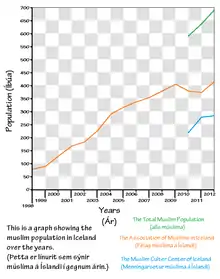 Une association des musulmans d'Islande (Félag Múslima á Íslandi), fondée en 1997, comptait 178 membres en 2006[2], 486 aujourd'hui. L'association Menningarsetur múslima á Ísland (Centre culturel musulman d'Islande), fondée en 2008, en compte 389 en 2015. La plupart vivent à Reykjavik ou dans sa banlieue ; il y a également quelques réfugiés kosovars à Dalvík.