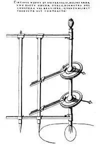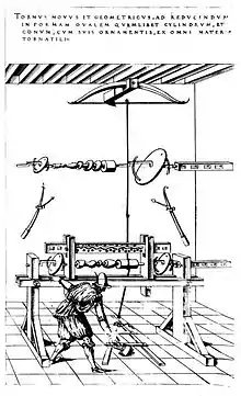 | Ellipsographe: compas à dessiner des ellipses, lors de la rotation du bras les disques inclinés impriment un mouvement suivant la projection du cercle |