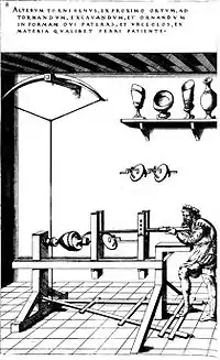 - En 1578, après la mort de Besson (v. 1572), fut publié, à Genève, le Théâtre des instruments mathématiques et mécaniques, une œuvre dans laquelle on note une évolution des techniques de tournage, avec l’apparition des premiers broches et des premières lunettes fixes[5]. D'autres éditions genevoises suivront en français, latin, italien, allemand et enfin espagnol, jusqu'en 1602. En 1683, une exposition mentionnée dans un catalogue intitulé « Explication des modèles des machines et forces mouvantes que l’on expose à Paris, dans la rue de la Harpe, vis-à-vis de Saint-Cosme » présenta vingt et un modèles de machines dont onze furent exécutées d’après les planches de Jacques Besson[5].