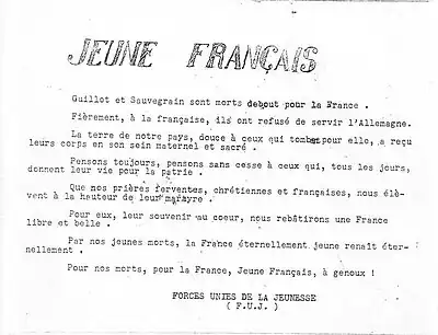 - Tract distribué à Toulouse par les Forces unies de la jeunesse à l'annonce de l'exécution de Jacques Sauvegrain et de son camarade Guyaux, qui avaient été tous deux élèves au lycée Pierre-de-Fermat de Toulouse