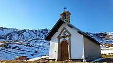 Peu avant le hameau de Notre Dame, la chapelle Rose, dite encore chapelle de la Varde ou encore chapelle Saint-Roch, posée sur son éperon rocheux, sur fond d'Aiguilles d'Arves enneigées. C'est le plus vieux édifice construit de Jarrier.