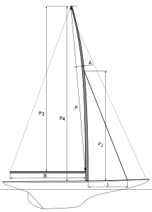 Ces conditions limites étant respectées, la voilure est jaugée en tenant compte d'un précintrage du mât, , qui sera ensuite interdit par la jauge. représente la hauteur du mât au-dessus de la bôme mise à l'horizontale, la longueur du mât de la bôme à sa tête (la corde d'un mât cintré), la longueur de la bôme. Ce qui donne la mesure de la grand-voile :