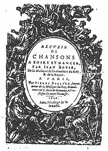 - IIe livre des chansons à danser et à boire de Jean Boyer, de la Musique de la chambre du Roy [1-2 v.]. Paris, Robert III Ballard, 1642. 1 vol. 8°. RISM B 4184, Guillo 2003 n° 1642-B. Cette édition a été recueillie en 1644 par Robert III Ballard (Guillo 2003 n° 1644-E) et en 1699 par Christophe Ballard (Guillo 2003 n° 1699-F).
