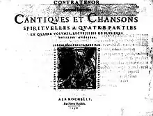 - Premier [-Second] livre des cantiques et chansons spirituelles à quatre parties en quatre volumes recueillies de plusieurs excellens musiciens. La Rochelle : Pierre Haultin, 1578. 4 vol. 4° oblong. RISM 15783 et 4. Seule la partie de contratenor est connue.