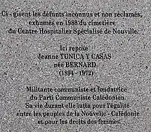 Jeanne Tunica est une femme politique française, née à Graissessac (Hérault) le et morte à Nouville (Nouvelle-Calédonie) le [1],[2]. Cofondatrice du Parti communiste calédonien, elle relaie les revendications sociales et politiques des Kanaks et des travailleurs vietnamiens de Nouvelle-Calédonie dans l'immédiat après-guerre. Forcée de s'exiler en raison des pressions politiques qu'elle subit, elle finira sa vie dans l'oubli.