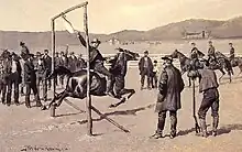 Des billets ont été émis par le propriétaire du jars, à cinquante cents chacun, à tous les messieurs présents qui le souhaitaient, et ils ont inscrit leur nom comme "tireurs". Les tireurs devaient s'élancer à une dizaine de mètres du jars, à cheval, à toute vitesse, et en passant sous le jars, ils avaient le privilège de lui arracher la tête - ce qui leur donnait droit au privilège supplémentaire de le manger...