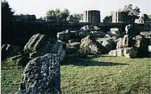 Élis et Olympie sont distantes de 36 kilomètres environ à vol d'oiseau[44]. Le résultat des fouilles ne permet pas une très bonne connaissance d'Élis antique, qui est donc principalement connue par la description qu'en fait Pausanias lors de sa visite de la ville[45]. Celui-ci mentionne un gymnase comportant une piste de compétition et une piste d'entraînement, tous deux ombragés de platanes, ainsi qu'un endroit appelé πλέθριον / pléthrion, qui sert aux hellanodices à examiner les athlètes et à effectuer les tirages au sort. Un deuxième gymnase, plus petit, est appelé « tétragone » (carré) en raison de sa forme ; il est réservé à l'entraînement des athlètes. Un troisième accueille le sénat des Éléens ; il est relié aux thermes et à l'agora, qui porte le nom d'hippodrome, parce que les Éléens ont l'habitude d'y entraîner leurs chevaux. Le bâtiment des hellanodices se trouve sur la rue qui va du portique sud à l'agora.
