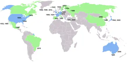 | Légende : en gras, la prochaine édition des JO ; en italique, les éditions futures déjà attribuées. | |||