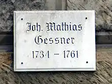 Johann Matthias Gesner ( à Roth an der Rednitz - à Göttingen) est un pédagogue, philologue et bibliothécaire allemand. Il fut le recteur du Lycée Saint-Thomas de Leipzig de 1730 à 1734. Il devient professeur de poésie et de rhétorique à l'Université de Göttingen lors de sa fondation en 1734, tout en prenant en charge la direction de la bibliothèque universitaire. Même s'il innove peu dans son travail d'édition des auteurs classiques, sa volonté de réformer l'enseignement scolaire et universitaire en fait l'un des pionniers du nouvel humanisme allemand (Neuhumanismus, avec par exemple Lessing, Herder ou Goethe). Sa principale œuvre, le dictionnaire en quatre tomes Novus Linguae Et Eruditionis Romanae Thesaurus, est aujourd'hui encore une source importante pour le Thesaurus Linguae Latinae, grand lexique du latin commencé en 1900.