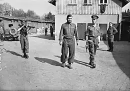 Josef Kramer, photographié fers aux pieds, extrait de sa cellule à Belsen, avant d'être transféré comme prisonnier de guerre à Celle, le .