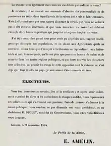 - « Commentaires sur la : Proclamation du préfet Amelin en faveur de Duguet, candidat gouvernemental aux élections législatives, 9 novembre 1864. », sur le site du Centre national de documentation pédagogique.