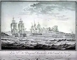 - En , une division aux ordres du contre-amiral français François-André Baudin, composée des vaisseaux le Robuste, le Borée, de 80 canons chacun, le Lion, de 74, des frégates la Pauline et la Pomone et d'une vingtaine de navires de transport, ayant reçu la même mission de ravitailler Barcelone, fut rencontrée par une escadre anglaise,aux ordres du contre-amiral George Martin, de force infiniment supérieure. Voyant que l’ennemi l’avait gagné de vitesse et cherchait à lui barrer le passage, Baudin ordonna à ses bâtiments de serrer fortement la terre ; mais cette manœuvre n’eut d’autre résultat que d’occasionner l’échouement du Robuste et du Lion. Le capitaine Senèz, qui commandait le Borée, se tenait plus au large, tout en se conformant aux ordres de son chef ; il parvint à passer au milieu de l’escadre anglaise et à s'échapper dans le port de Sète, normalement trop petit pour les vaisseaux de ligne. Pour soustraire le Robuste et le Lion aux Britanniques, Baudin les fit saborder par le feu près de Frontignan.