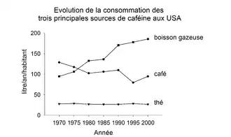 L'évolution de la consommation de ces trois sources de caféine aux États-Unis est présentée dans le graphique ci-contre. Il semble étonnant de voir la place qu'occupe le Brésil dans le classement des pays consommateurs. Cela tient probablement au fait que la consommation locale doit échapper aux chiffres officiels sur lesquels ce graphique est construit.