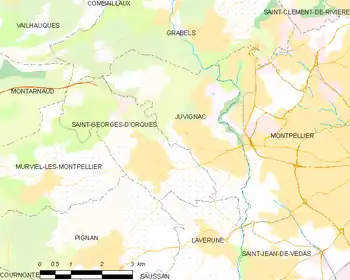 Juvignac est une commune urbaine, car elle fait partie des communes denses ou de densité intermédiaire, au sens de la grille communale de densité de l'Insee[Note 2],[12],[I 1],[13]. Elle appartient à l'unité urbaine de Montpellier, une agglomération intra-départementale regroupant 22 communes[I 2] et 473 092 habitants en 2021, dont elle est une commune de la banlieue[I 3],[I 4].