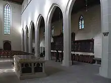 Le cycle des vitraux du chœur, réalisé entre 1325 et 1360, a été conservé dans sa plus grande partie ; il compte parmi les plus importantes des œuvres d'art européennes du XIVe siècle[12]. La plupart des hautes fenêtres gothiques montrent des scènes en cinq parties, chacune consacrée à un thème. Sur le côté sud, toutes les fenêtres n'ont pas été conservées. Dans l'abside est représentée la Passion du Christ, flanquée par des vitraux consacrés à l'Incarnation et à la Résurrection du Christ. La paire de vitraux suivante montre le précurseur, Jean-Baptiste (accompagné de sainte Catherine), et le successeur, l'Apôtre Paul (accompagné de Marie). La troisième paire de vitraux est consacrée aux apôtres. Les deux paires de vitraux suivantes sont dédiées à des saints avec lesquels l'Ordre ou la famille fondatrice avait une relation particulière : saint François, saint Nicolas, sainte Anne et sainte Claire[13].