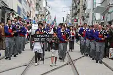 À la fin des années 1960, la Kevrenn ouvre ou clôture le défilé de la Fête des Écoles, accompagné du bagad du collège technique, devenu Lycée Jules-Lesven à Brest, créé par Yves Tanguy, alors maître d'internat, afin de représenter fièrement l'école. La fierté et l'émotion envahissent les brestois au passage dans les grandes rues reconstruites des longues rangées de sonneurs, un triomphe des sonneurs en apothéose du Festival international des cornemuses, afin d'adapter les pratiques au cadre de la ville, jouant l'air commun des concours à l'unisson[56]. Le déplacement du festival de cornemuses à Lorient en 1970 s'accompagne en 1971 d'une division du championnat de première catégorie en trois épreuves au lieu d'une.