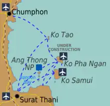 L'aéroport est situé près de l'embarcadère du Big Bouddha d'où les ferries partent vers Ko Pha Ngan. Des ferries rapides pour Koh Tao et Chumphon partent de l'embarcadère de Maenam, à 6 km environ au nord-ouest de l'aéroport.