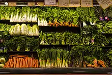 Un légume est la plante ou la partie d'une plante comestible d'une espèce potagère[1]. Cette définition, reprise par la plupart des dictionnaires de langue française, peut être étendue aux champignons comestibles, dont certains sont cultivés (champignon de Paris, shiitaké, etc.) et à certaines algues, dont la consommation est la plus développée en Extrême-Orient[2]. Cette partie peut être une racine (carotte, betterave rouge), un tubercule (pomme de terre, topinambour), un bulbe (oignon)[3], une jeune pousse (asperge, pousse de bambou), une pseudo-tige (poireau), un pétiole (bette, céleri), un ensemble de feuilles (laitue, endive), une fleur (artichaut, chou-fleur, brocoli), un fruit immature (haricot vert, pois mangetout, concombre), un fruit mature (tomate, épi de maïs), ou une graine (pois cassé, haricot sec, fruit sec), etc.[2]