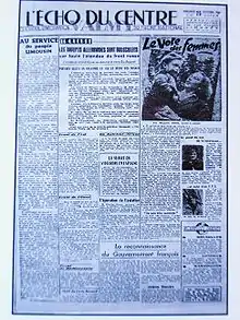 Le mercredi , le journal peut paraître au grand jour et devient L'Écho du Centre, quotidien d'information du Front national. Le nom de VALMY ! figure encore, en grisé, sous le titre principal. Le quotidien fait partie des journaux fondateurs de l'Union française de l'information, agence de presse qui regroupe près d'une centaine de journaux locaux résistants.