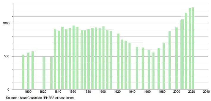 L'évolution du nombre d'habitants est connue à travers les recensements de la population effectués dans la commune depuis 1793. Pour les communes de moins de 10 000 habitants, une enquête de recensement portant sur toute la population est réalisée tous les cinq ans, les populations légales des années intermédiaires étant quant à elles estimées par interpolation ou extrapolation[25]. Pour la commune, le premier recensement exhaustif entrant dans le cadre du nouveau dispositif a été réalisé en 2007[26].