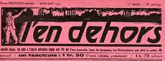 Le second journal L'En Dehors [en deux mots] parait en 1922[1] sous la direction d'E. Armand (nom de plume d'Ernest Juin). La publication est bimensuelle. E. Armand y prône la liberté individuelle tant pour le règlement d'affaires entre individus que dans le domaine des libertés sexuelles[4]. Collaborent à ce journal des personnalités variées comme Eugène Bizeau, Madeleine Pelletier, Han Ryner. La publication de l'En Dehors cesse en [1]. E. Armand publiera après la guerre un autre périodique : L'Unique[5].