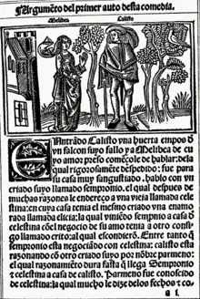 Calixte, jeune homme de noble naissance, d’un esprit distingué, d’agréable tournure, d’une éducation peu commune, d’une fortune moyenne, est pris d’amour pour Mélibée, jeune fille d’une grande beauté, d’une naissance haute et pure, possédant une grande fortune, unique héritière de son père Plebère et tendrement aimée par sa mère Alisa. Calixte poursuit Mélibée des plus vives instances, et, aidé par Célestine (femme méchante et rusée à laquelle se joignent deux serviteurs de Calixte qu’elle a séduits et rendus infidèles par l’appât du plaisir et du profit), il parvient à vaincre la chaste résistance de la jeune fille. Les amants et ceux qui les aident ont une fin malheureuse et amère. Le commencement de cette triste histoire est l’œuvre du hasard, qui méchamment met Calixte en présence de celle qu’il aime.