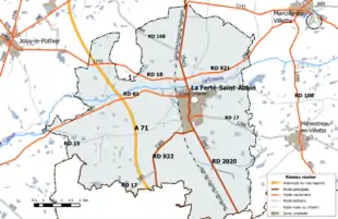 La RD 2020 est l'ancienne Route nationale 20, transférée au département du Loiret par arrêté préfectoral du [37], consécutivement au décret du [38] qui définit la nouvelle consistance du réseau routier national et qui prévoit de ne maintenir dans le réseau routier national que la partie la plus méridionale de la route, entre le débouché de l'A66 et l'Espagne. Cet axe traverse la commune du nord au sud et supporte en 2014 un trafic de 13 423 véhicules/jour au nord de l'agglomération de La Ferté-Saint-Aubin, et de 5 957 au sud. Le trafic poids-lourds journalier supporté est de 792 véhicules (9,2 % du trafic total) au nord du bourg et de 548 (9,2 %) au sud[39].